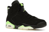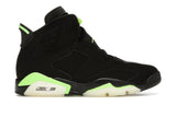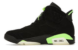 Description- The Air Jordan 6 Retro 'Electric Green' showcases a two-tone color scheme that recalls an Oregon PE colorway first seen online in 2018. The silhouette features a black nubuck upper with contrasting accents of neon green on the tongue and pull tab. Embroidered Jumpman branding arrives on the sneaker’s back heel. A polyurethane sole provides lightweight cushioning, highlighted with additional green hits and fitted with a visible Air sole unit. Underfoot, the semi-translucent rubber outsole is treated to a glow-in-the-dark finish.