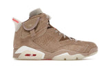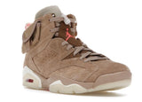 Description- Following on the heels of the coveted ‘Olive’ colorway from 2019, the Travis Scott x Air Jordan 6 Retro ‘British Khaki’ reunites Jordan Brand with the Houston rapper. The upper is crafted with suede and canvas, accented with Bright Crimson details. The stash pouch makes a repeat appearance on the lateral collar, while new zippered detailing is added to the medial side. Mismatched Nike Air and Cactus Jack branding adorns the heel of the left and right shoe, with additional graphics on the midsole, outsole, tongue and lace lock.